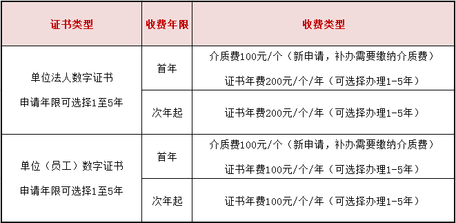 新申請單位員工證書1個:100*年限+介質費。例:新申請1個單位員工證書3年有效期,100*3+100=400元。