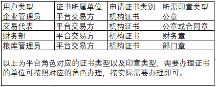廣州糧食交易綜合服務平臺各角色對應需要的證書如圖所示:
