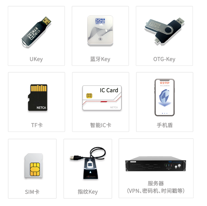 網證通CA的證書介質形態多樣如下圖1所示,可以滿足不同場景的應用。具體如下: