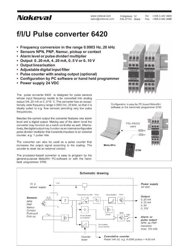 脈沖轉換器6420設計用于需要將輸入頻率轉換為0/4...20 mA或0...5/10 V模擬輸出的脈沖傳感器,該轉換器的頻率范圍非常寬,為0.0003 Hz...20 kHz,因此非常適合提供非常低脈沖頻率的流量傳感器。 除了電流輸出,轉換器還具有一個報警電平和一個數字輸出。利用報警電平,轉換器也可以作為一個批處理控制器來使用。另外,數字輸出可以作為一個內部可配置的脈沖分壓器/乘法器,將脈沖傳輸到外部計數器,例如1個脈沖/升。 轉換器也可以作為脈沖計數器,根據縮放增加輸出信號。計數器通過一個外部觸點進行復位。 基于處理器的轉換器很容易通過通用的MekuWin PC軟件或手持式編程器6790進行編程。